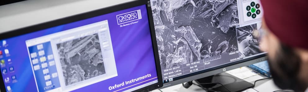 Materials testing scientist using microscope for quality analysis at Element laboratory