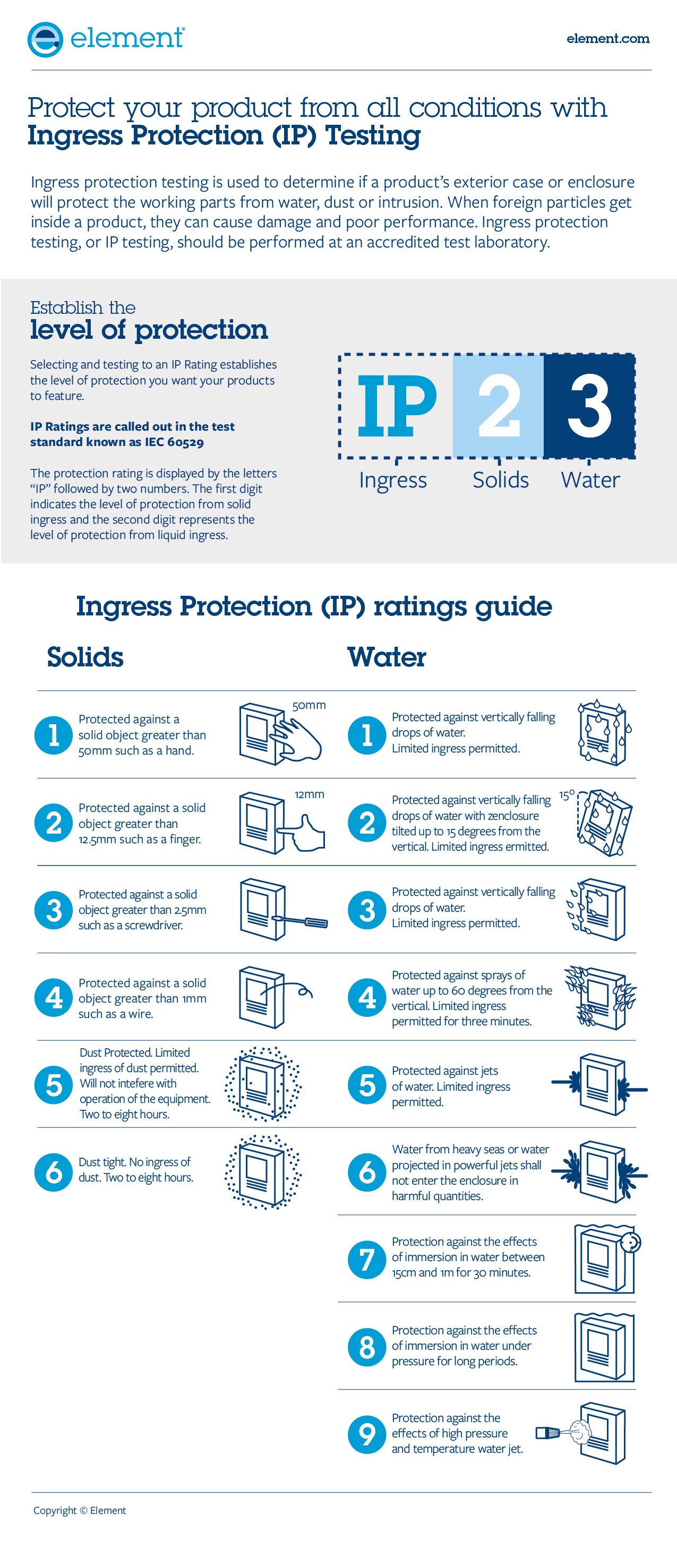 Element's guide to Ingress Protection (IP) testing infographic explains how the IEC 60529 standard classifies electrical equipment's resistance to solid particles and liquids. This essential testing determines your product's IP rating - establishing its protection level against dust and water intrusion - helping manufacturers ensure their enclosures meet international safety requirements for harsh environments.