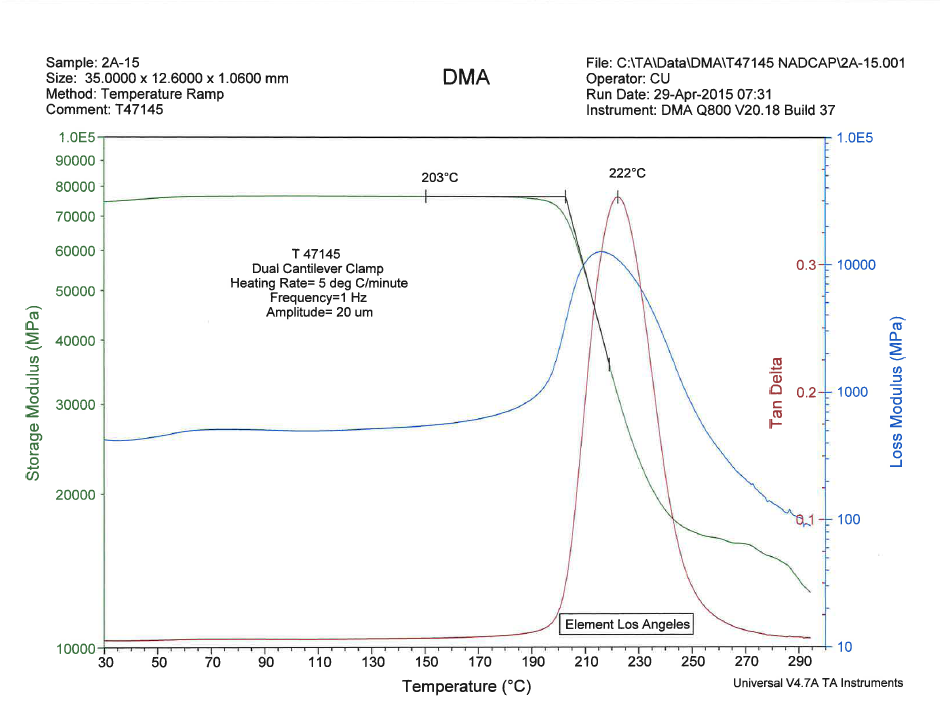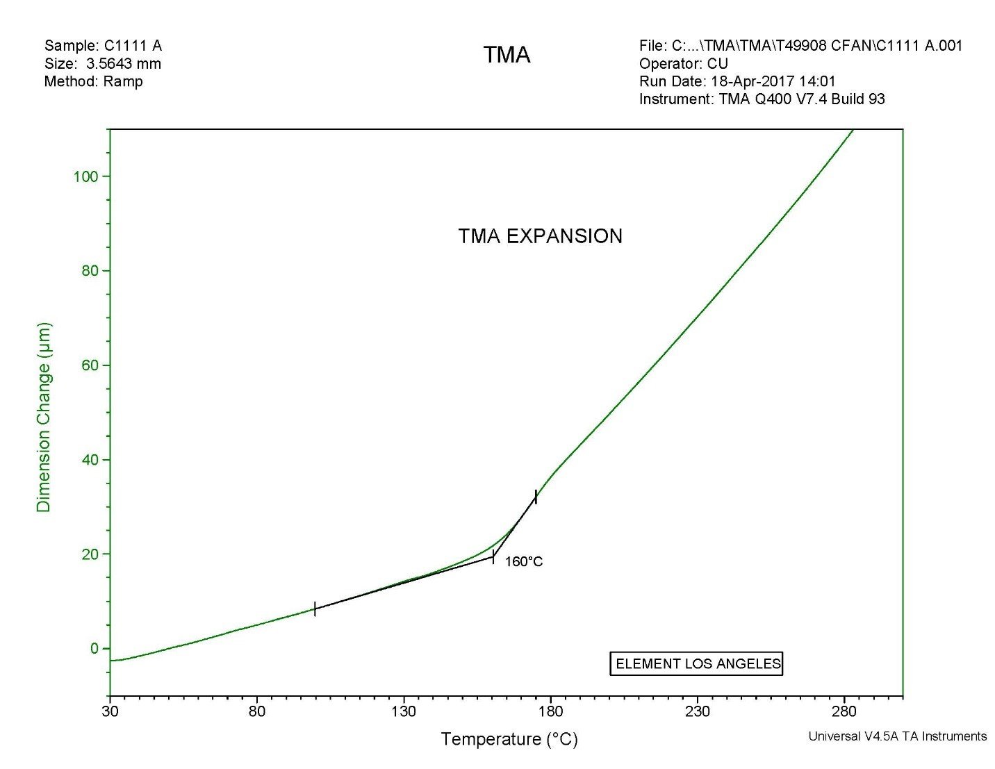 Thermomechanical Analysis (TMA): A thermomechanical analysis uses a small sample of material, which is heated on a quartz stage. A rod inside the machine places a small amount of force on the top of the sample, and the movement of the rod is measured with a linear variable differential transformer or LVDT. The entire instrument is heated at a slow rate, usually 5 degrees C per minute. This data is reported as a curve, where change in length is plotted versus temperature. The slope of the resulting curve is called the coefficient of linear thermal expansion, or COLTE. The glass transition temperature is the point at which the slope of the line changes, as seen below.