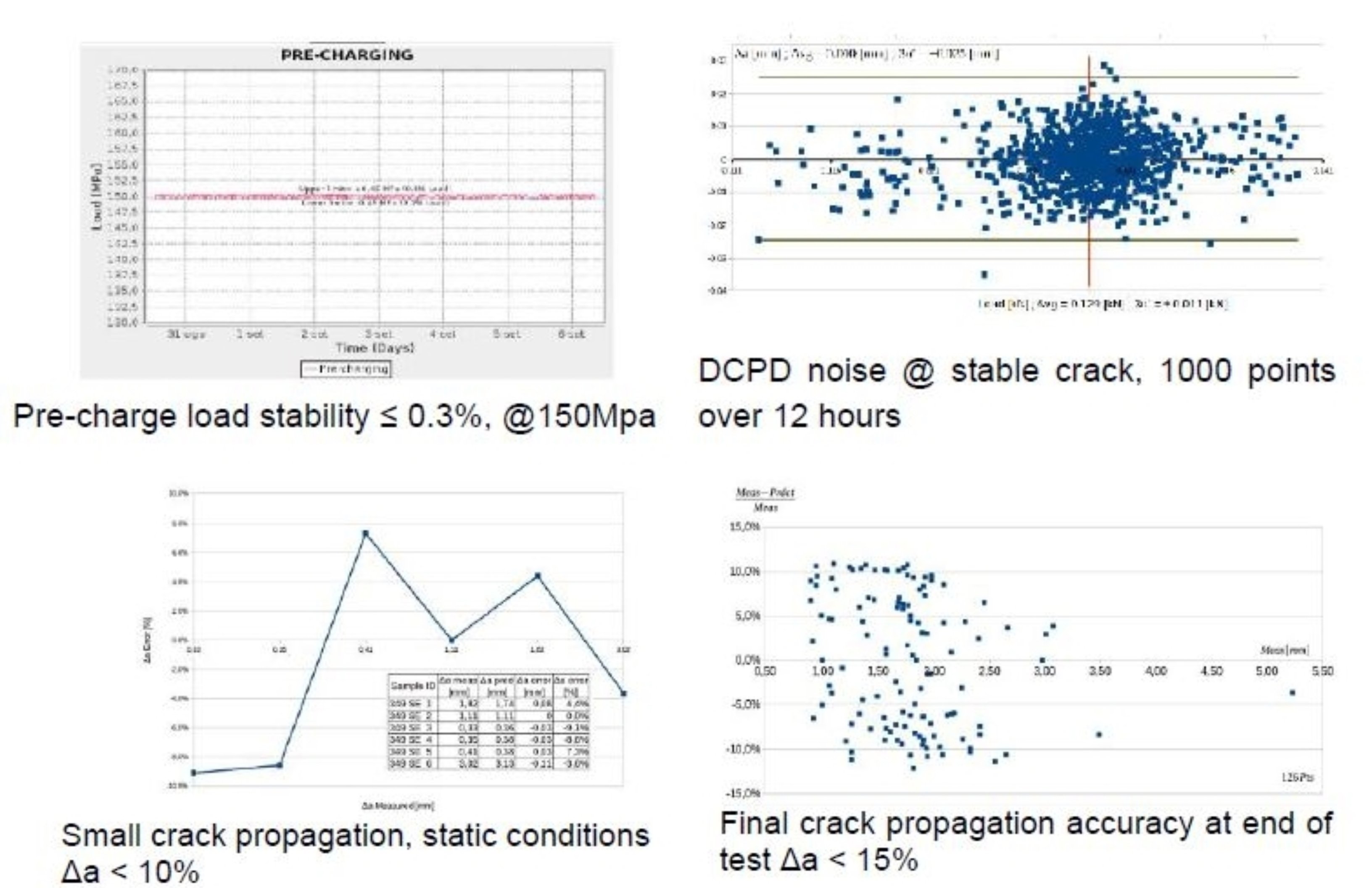 Before the fracture mechanics test, samples are pre-charged in H2S at pre-selected loads using special loading frames able to apply constant load up to 250kN. Load stability is monitored throughout the pre-charging time for crack stability. Tests are stopped when there is crack propagation and samples analyzed. Data logs are saved for future investigations and checks. Crack monitoring is achieved using a Direct Current Potential Drop (DCPD) system electronically switched sequentially and cyclically among all pre-charging frames. DCPD electronic amplifiers, filters, duty cycle and sampling frequency have been designed to have high accuracy over all the measurement period. The software was developed to control the DCPD system allows a real-time estimate of the crack growth during the test. The pre-charging period is typical of 1 week.