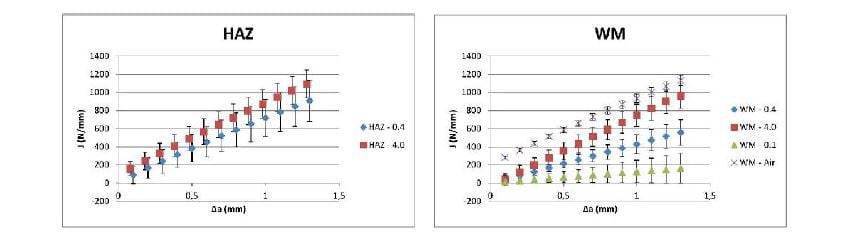 The test results on SENT samples, X65, BxB 36 mm, surface notch NQ, from cap side, HAZ and WM are shown in the J-R curves below. The welding was performed using the same welding team for each sample, using the same equipment and on the same material lot. Each series of experimental points represents the mean and standard deviation of the data from 10 samples. Another 10 samples have been tested in WM in air for comparison.