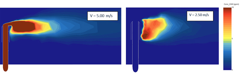 The challenge of this work was both to run transient CFD simulations of a damaged flare tip with multiple crosswind velocities and to accurately model the physics of combustion. This meant that the model needed to be optimized for capturing the region of the plume as well as capturing the combustion of methane. The crosswind needed to be modeled to interact with the flow of methane accurately as well. Following this, a calculation of all the methane destroyed in the fluid domain had to be carried out to determine the destruction efficiency of the flare tip.