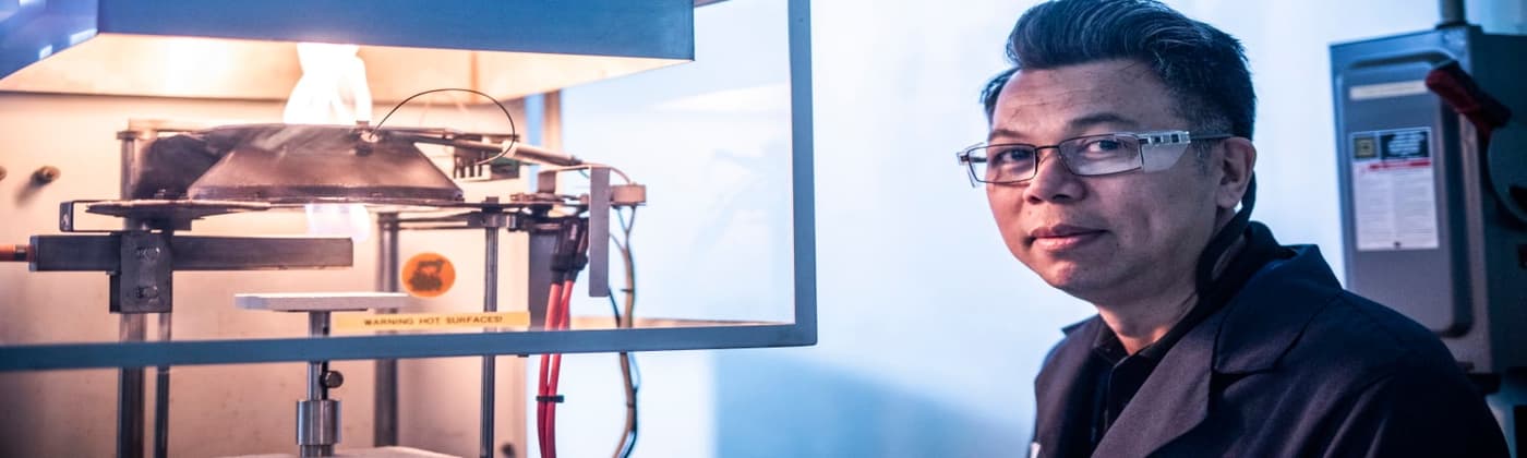 Element fire and flammability testing engineer standing in front of test frame glowing from high-temperature fire testing