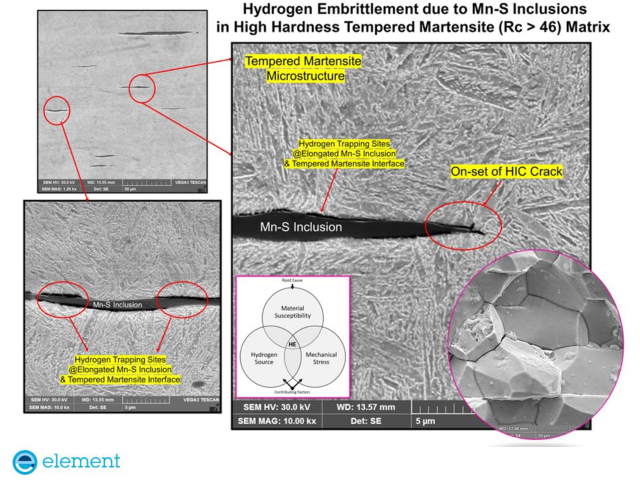 Once absorbed, atomic hydrogen recombines in the various trapping sites like voids/inclusion sites or internal defects in the material to form hydrogen molecules (H2), which create pressure from within the metal. This pressure can increase to the levels where cracks initiate and eventually lowers the stress required for these cracks in the metal to propagate, resulting in embrittlement (brittle fracture).