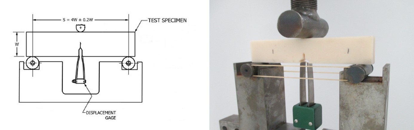 If the cement has brittle behavior, a fatigue pre-crack works best. An SENB specimen is loaded into a 3 point bend fixture (Figure 2), outlined in the ASTM E399 specification, to generate the fatigue pre-crack and conduct the fracture toughness test.