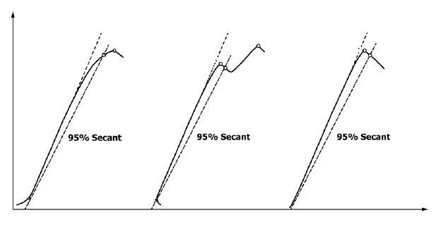ASTM E399 and D5045 are the ideal test methodologies for brittle materials. Three force-displacement modes exist (Figure 3) with a 95% deviation (or secant) from the initial linear portion. On this figure, the point where the 95% deviation crosses the test data is important for determining test validity (it qualifies as a K1C – qualifying that the specimen size was sufficient to plane-strain conditions). As the difference between this 95% deviation intersection and the maximum force increases, the greater the likelihood that the test will be invalid. ASTM E399 allows using an alternative test method if this difference is too large.