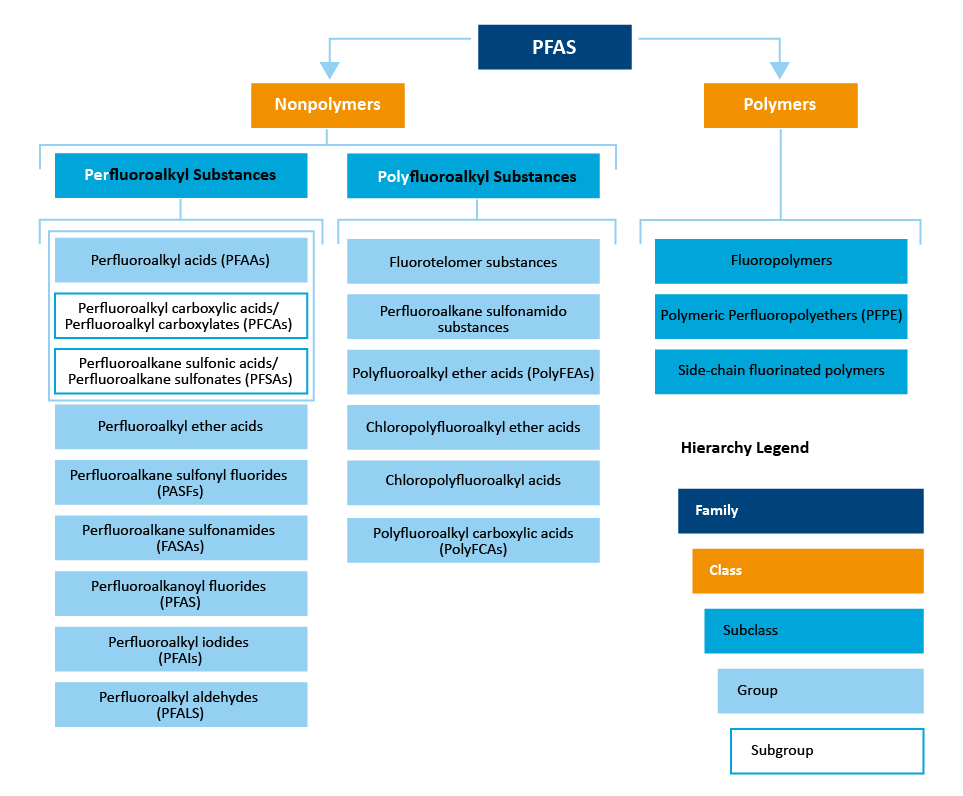 The Interstate Technology & Regulatory Council has prepared a PFAS Technical and Regulatory Guidance Document, updated September 2023 (https://pfas-1.itrcweb.org/wp-content/uploads/2023/12/Full-PFAS-Guidance-12.11.2023.pdf ) which provides a PFAS family tree (Figure 2-4), reproduced below. This captures some of the wide variety of PFAS compounds including two primary classes: polymers and nonpolymers. Each class may contain many subclasses, groups, and subgroups, some of which are shown in the figure below.