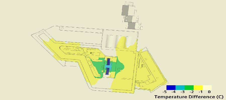 Above, the CFD model shows the temperature difference in the area around the heat pumps.