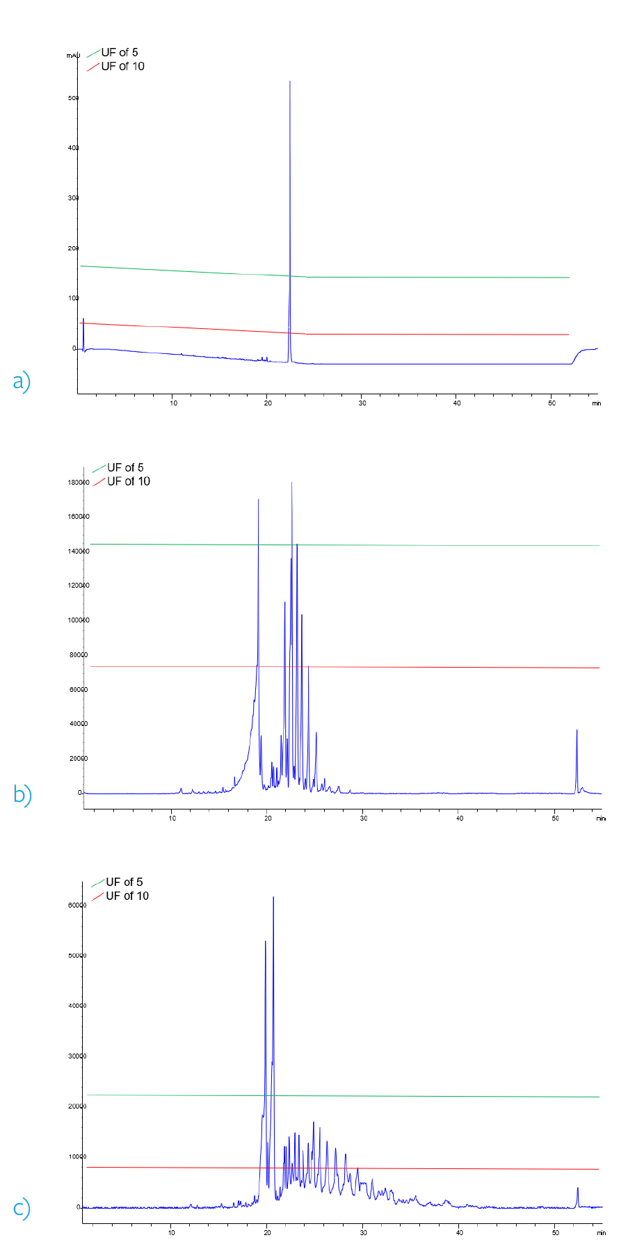 Figure 2. Comparison of approximate integration thresholds corresponding to different UF. a) 230 nm UV chromatogram b) ESI positive base peak chromatogram c) ESI negative base peak chromatogram.