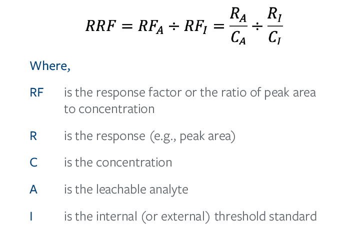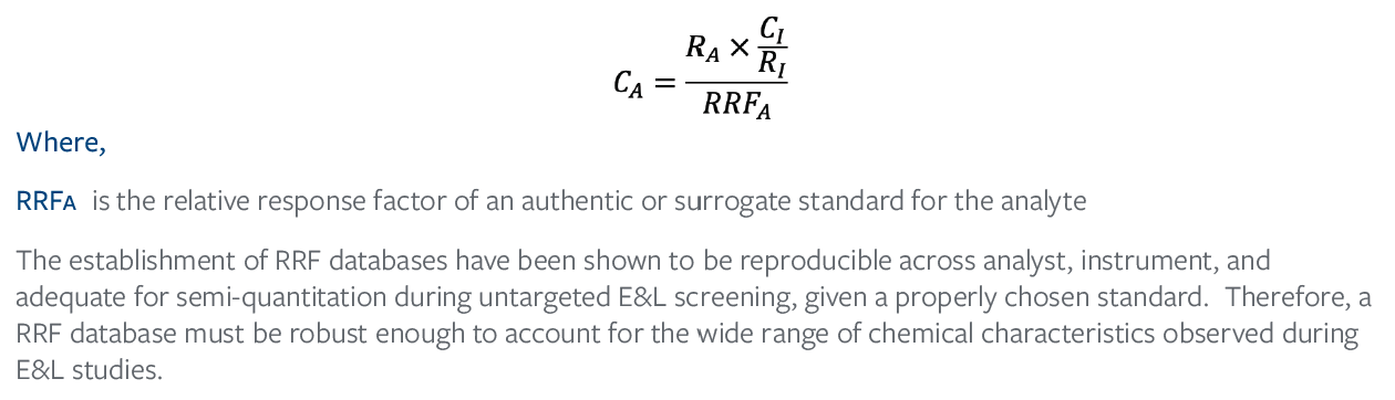 A response factor can only be calculated when the concentration of the analyte is known. However, during untargeted analyses, like E&L screening, the concentration of analytes is unknown. Therefore, during untargeted analyses a relative response factor (RRF) is employed for estimating concentrations. RRFs utilize an internal or external standard at a known concentration as a “ruler” by which the AET equivalent response can be established or by which the concentration of unknowns can be estimated, see Eq. (2).