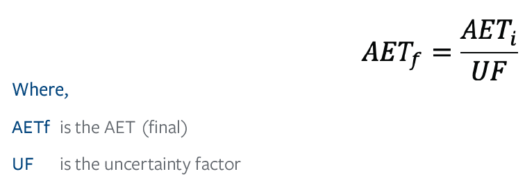 The above examples are relatively rudimentary examples of analytical uncertainty, but, nonetheless, demonstrate the need to account for uncertainty within an AET. To account for the analytical uncertainty, the AET is adjusted by dividing the AET (initial) by an uncertainty factor (UF) as shown in Eq. (3).